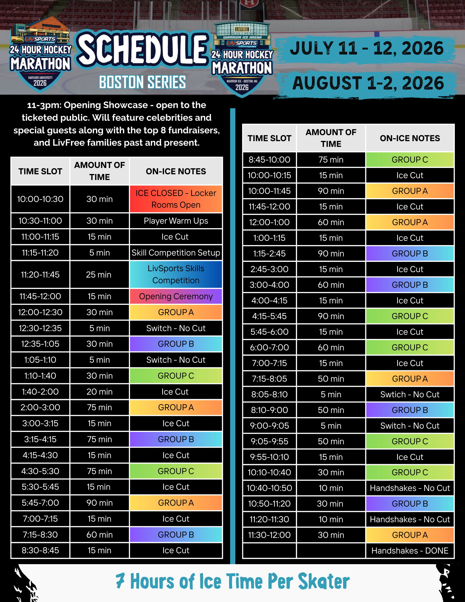 During registration, you’ll answer a few short questions to help us place you in the right division and form balanced teams. Each division will feature two teams that play each other throughout the 24 hours — ensuring plenty of time on the ice for everyone.